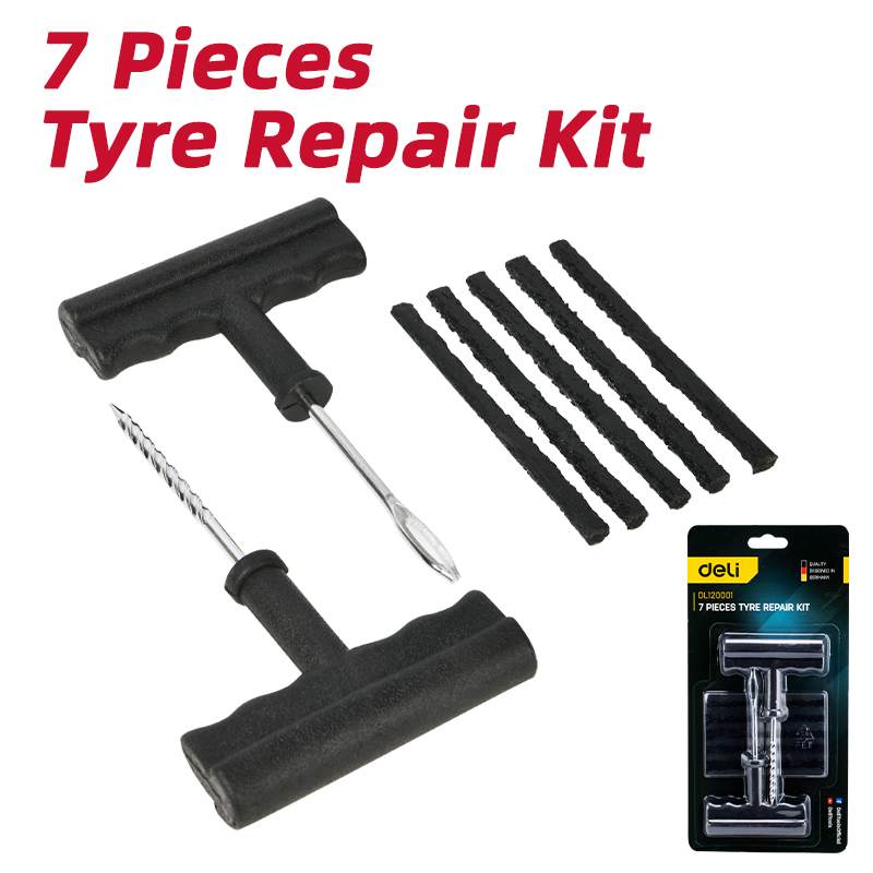 Salah satunya adalah Deli Tools 7 Pieces Tyre Repair Kit, yang menyediakan perlengkapan lengkap dalam satu paket ringkas untuk membantu perbaikan ban tubeless pada motor maupun mobil.